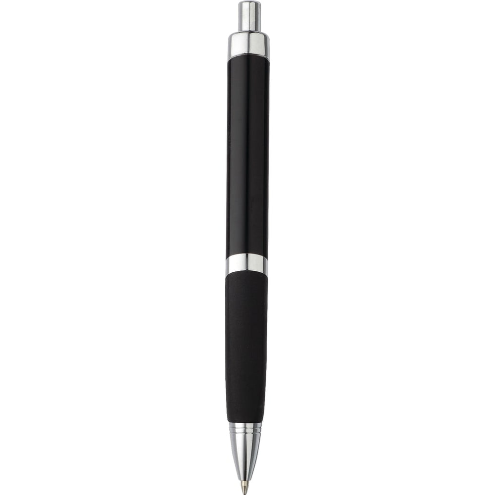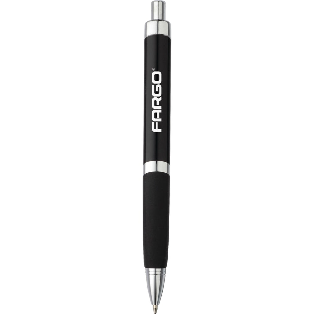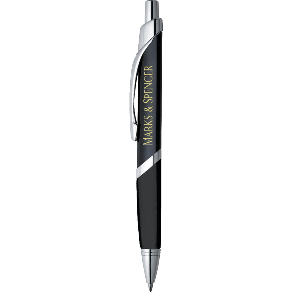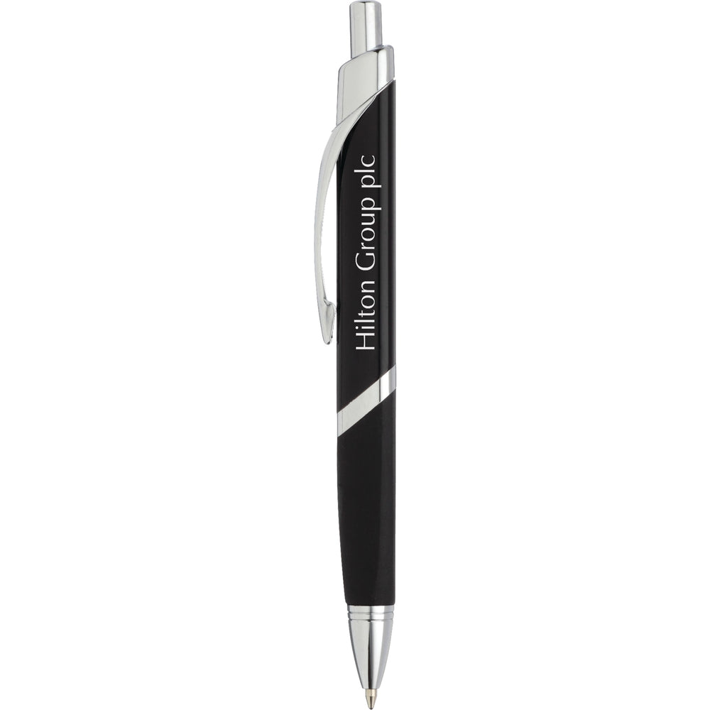 The SoBe Ballpoint Pen has a retractable ballpoint that features a triangular-shaped barrel with chrome trim. It comes in several different colors. This pen features a 1.0mm tip and black/blue ink. Laser finish is shiny brass.