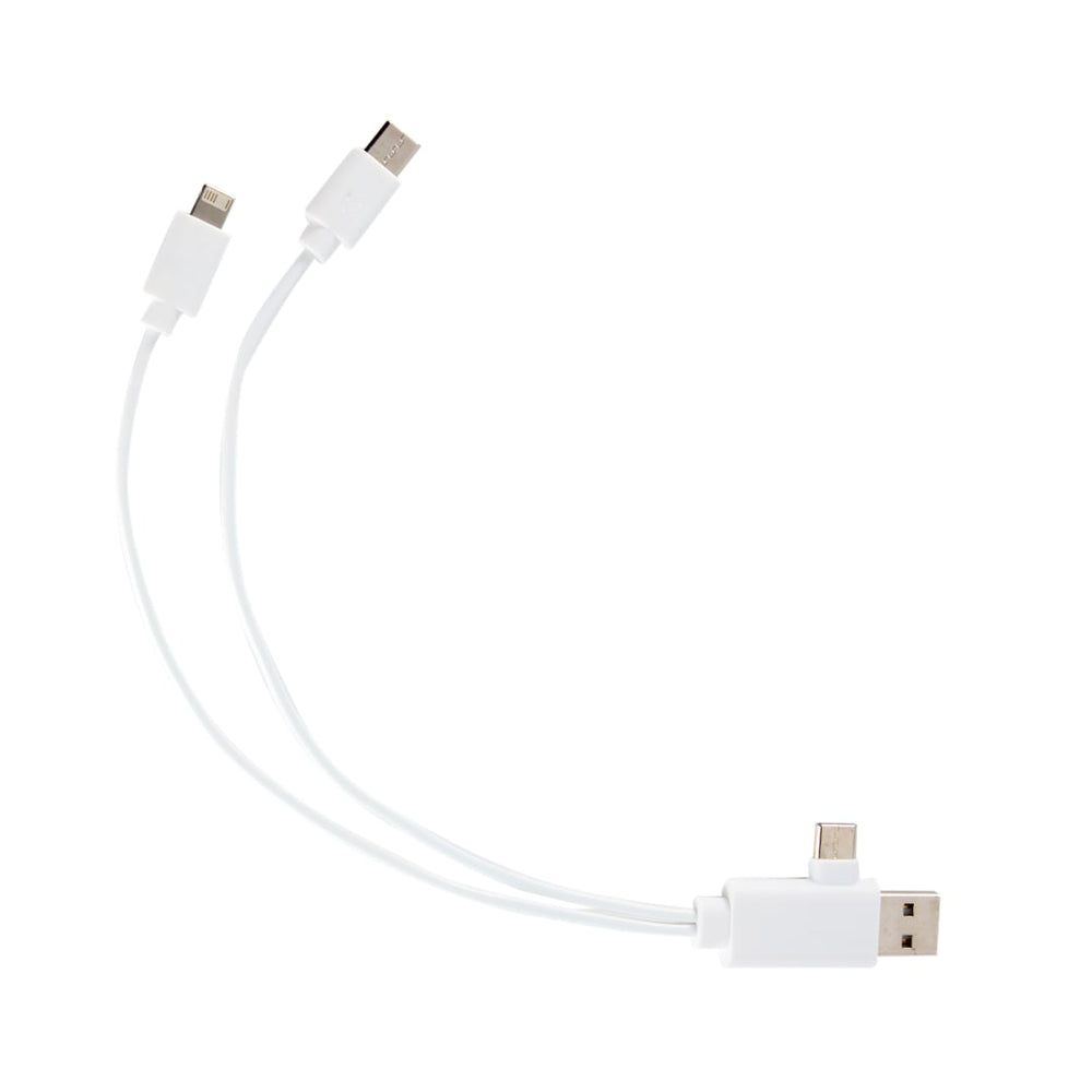 The 5-in-1 Recycled Charging Cable features 9.8-inch long, with a USB Type-A input tip and a USB Type-C input tip at one side, and the other side contains one cable with a Type-C output tip and the other cable with a two-in-one dual compatible tip for both Apple iOS and Android devices (up to 5V/2A, 10W charging speed). It features casing crafted from 100% recycled materials. It is recommended to use an AC adapter, power bank or car charger to charge devices, instead of using outputs from laptop or computer as power source.