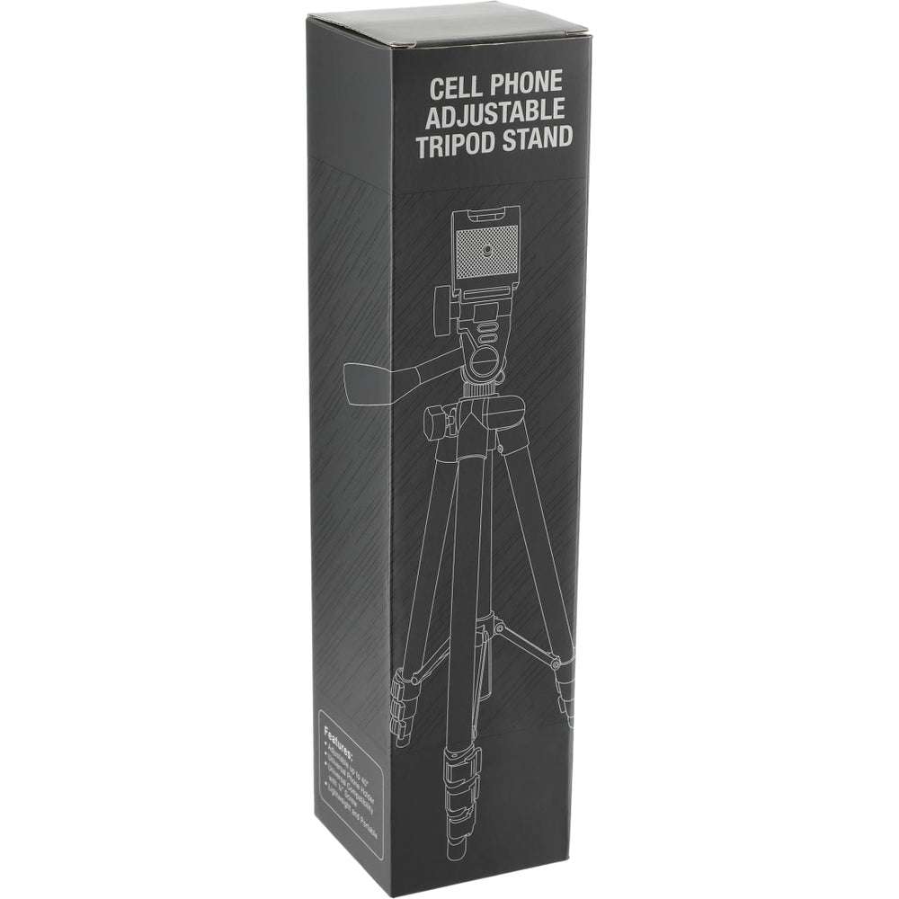 Create the perfect photo or video with the Cell Phone Adjustable Tripod Stand. The stand features a 1/4" screw that can support most cameras and a universal phone holder. The phone holder fits phones from 2.25" to 3.75" wide. The tripod height adjusts from 10" up to 40", and the built-in clips let you adjust to the height of your preference. The entire tripod weighs less than 0.75lbs, making it easy to carry in the included travel bag.