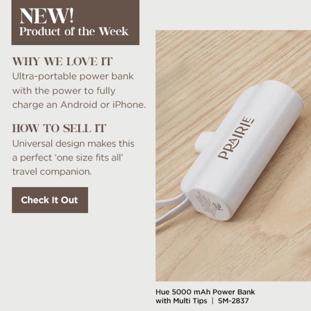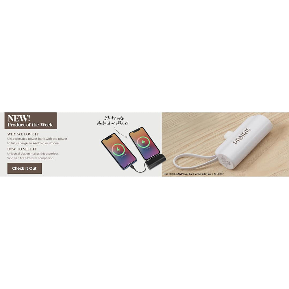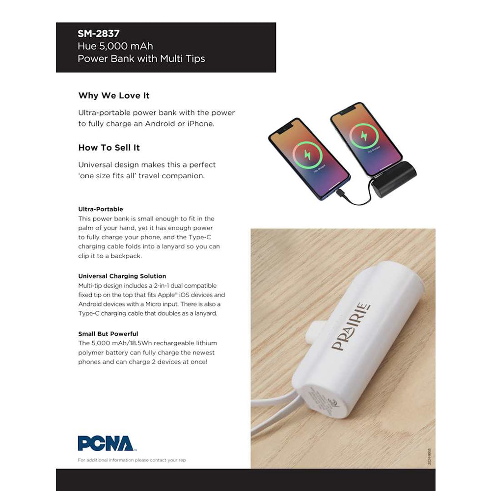 The Hue 5000 Wireless Power Bank with Multi Tips features a 5,000 mAh/18.5Wh rechargeable lithium polymer battery, an integrated 5.5-inch cable with Type-C tip as a lanyard and 2-in-1 dual compatible fixed tip for Apple® iOS devices and Android devices with Micro input . Tips Outputs: 5V/2A. Includes a 11.8-inch USB-A to Type-C charging cable. Power banks are permitted in carry-on luggage only, and at the discretion of TSA agents. Please charge the power bank before initial use.