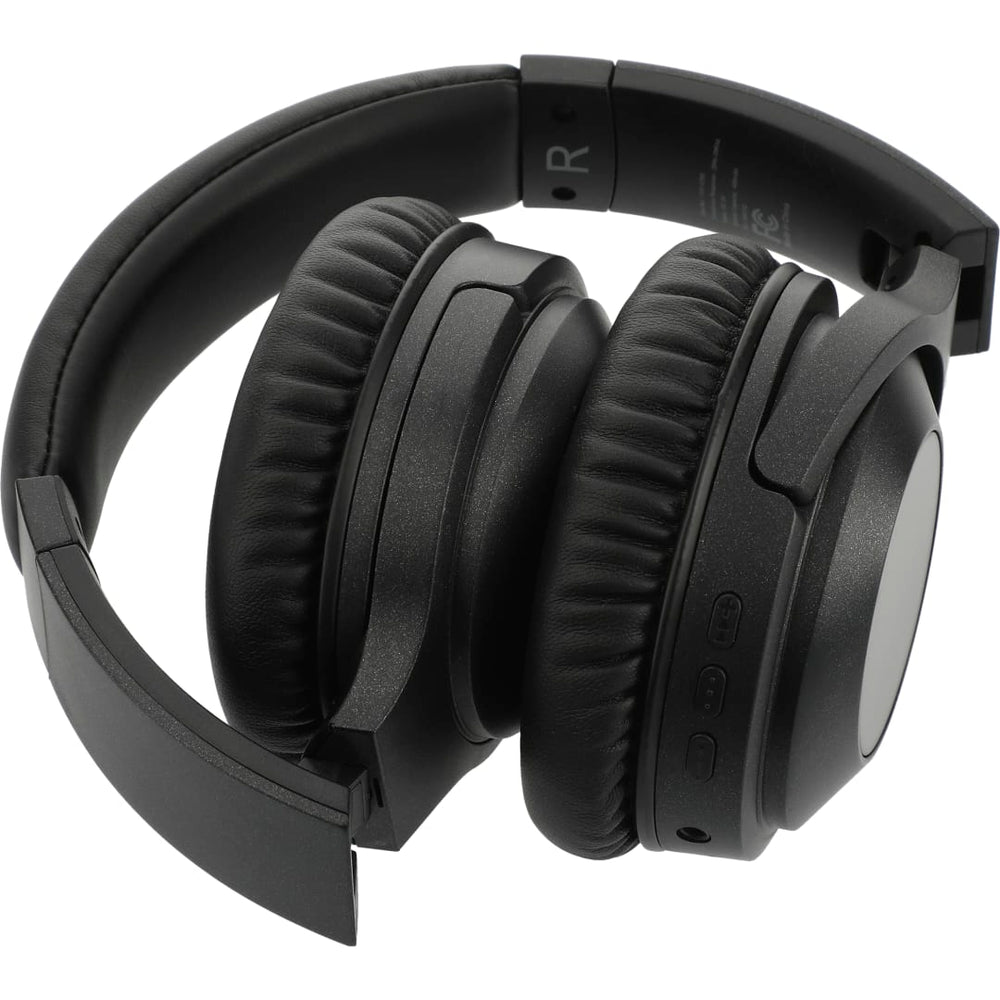 Become immersed in your music with the Hush Active Noise Cancellation Bluetooth Headphones. These headphones deliver premium stereo sound up to 15 hours at max volume. When the active noise cancellation is turned on it will block out up to 20-23db of sound. Allowing you to enjoy your long flight, train ride, or day in the office without any disruptions and in comfort with the memory foam earpads. The built-in music controls and microphone allow you to control your audio and answer a call without reaching for your phone. With a collapsible and flexible design, the headphones can be carried in the provided woven pouch or around your neck. Music can be enjoyed through Bluetooth or with the provided 20” 3.5mm Aux Cable. Playback time at max volume with ANC On: 10hrs. Charging Time: 2hrs Bluetooth Version 5.0. Micro USB charging cable provided. Bluetooth working range is 10 meters (33 feet).