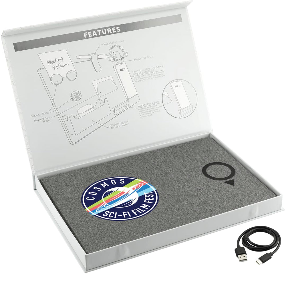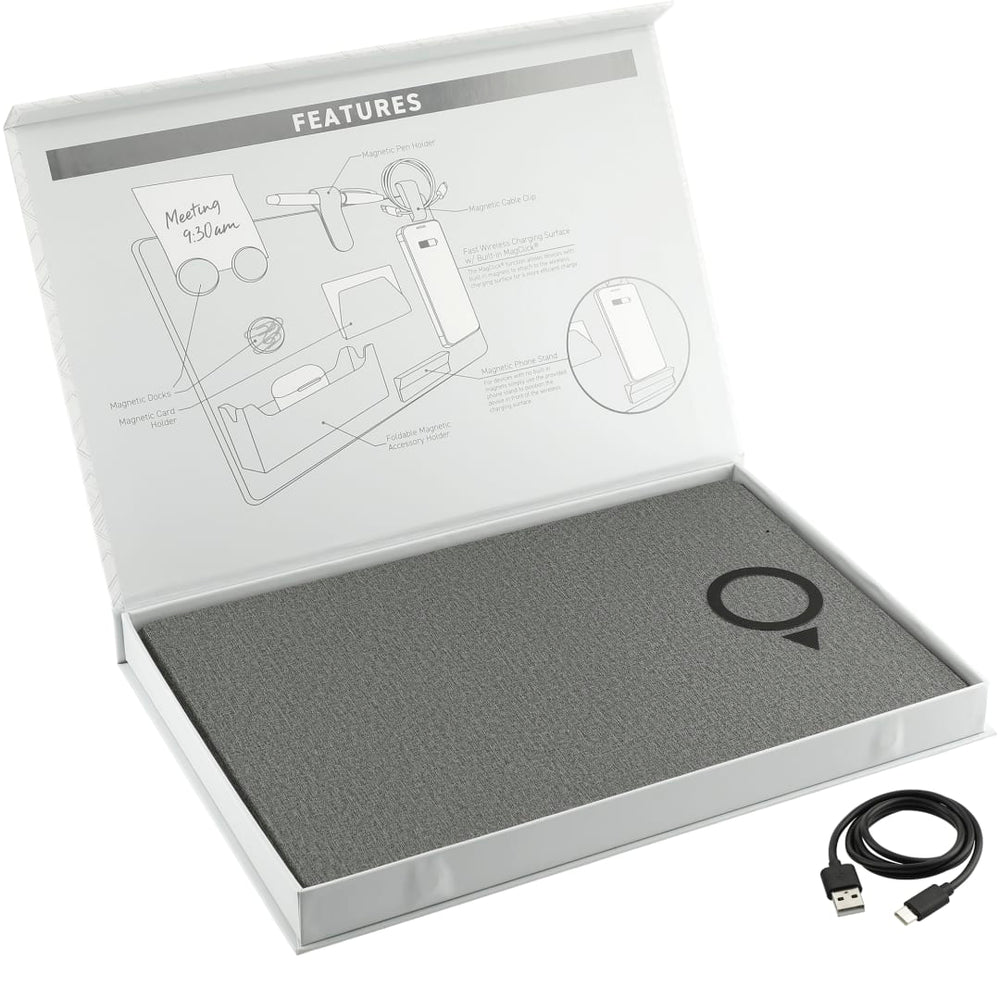 The MagClick™ Fast Wireless Charging Desk Organizer includes a clipboard, three magnetic docks, one foldable accessory holder, one card holder, one pen clip, one cable clip and one foldable phone stand, making it easy to organize your desk. The board has wireless charging area that magnetically attaches to iPhone 12/13 models for wireless charging. Using the foldable phone stand, other smartphones can be charged wirelessly. Supports three different wireless charging modes: 7.5W for iPhone X/8/8 Plus/XS/XS Max/XR/11/11 Pro/11 Pro Max/12/12 Pro/12 Pro Max/12 Mini/13/13 Pro/13 Pro Max/13 Mini; 10W for Samsung Galaxy S9/S9 Plus/S8/S8 Plus/Note 8/9 and more, and 5W standard charging for all other enabled devices. Includes a 39-inch USB-A-to-Type-C charging cable. It is recommended to use quick charge power adapter (10W at least, not included) to achieve fast charging. Packaged in a premium gift box.