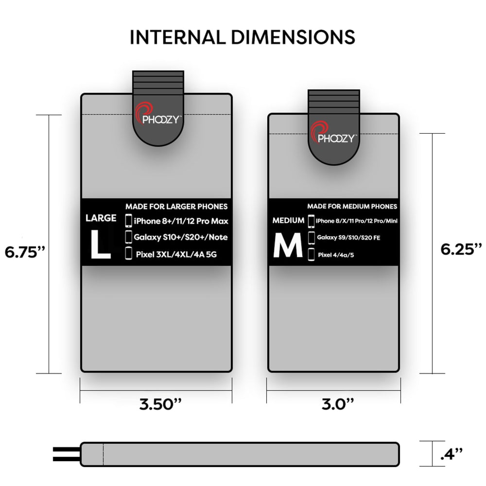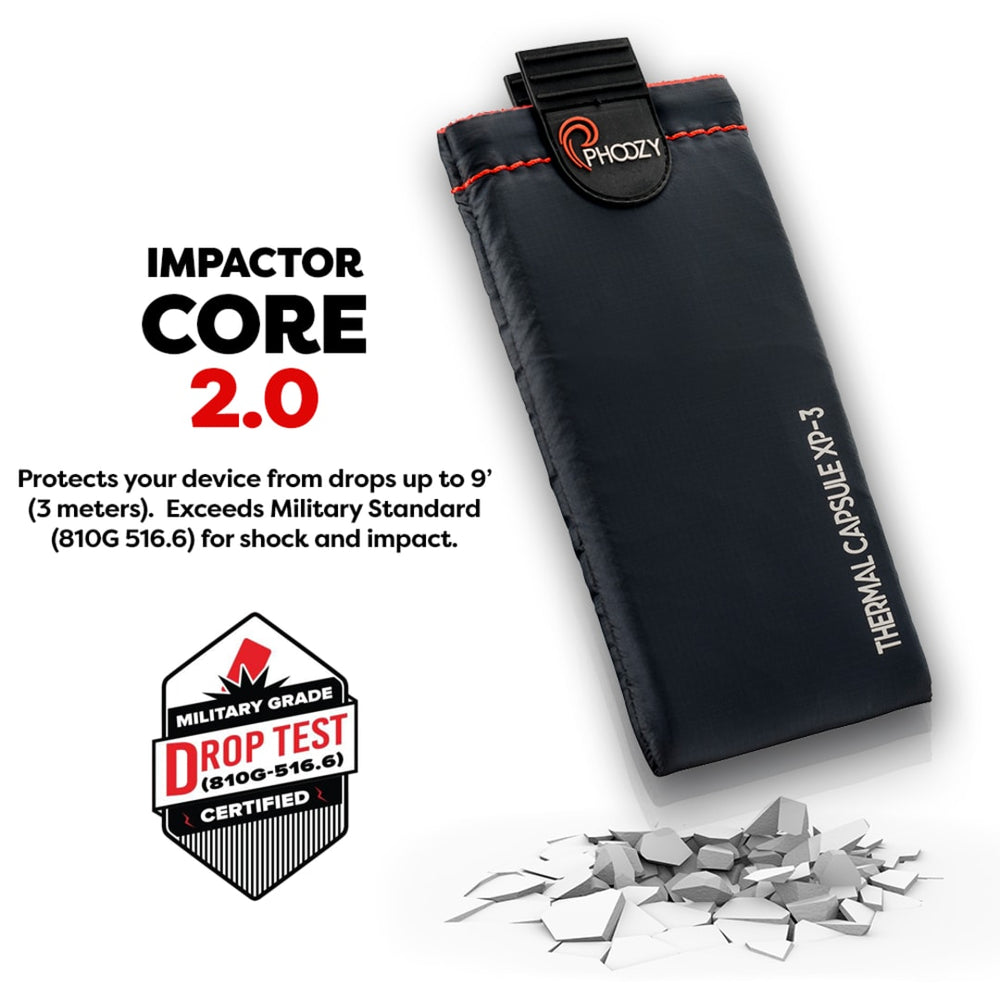 Keep your smartphone safe with the PHOOZY XP3. As seen on Shark Tank, this durable case is packed full of features like multiple attachment points that let you quickly and easily clip it to a bag and go. An internal stash pocket is made for your cards and cash, so you can say goodbye to bulky wallets. The material of the Phoozy XPS is derived from NASA spacesuit technology, reflecting more than 90% of the sun's heat to prevent overheating and permanent damage to your device while also insulating your device in cold conditions to extend battery life up to 4X (compared to not using a PHOOZY). The interior dimensions of the Phoozy are 6.75" x 0.40" x 3.6", making it compatible with iPhone 8+/XR/XSMax/11/11ProMax/12ProMax /13Pro/13ProMax, Galaxy S9+/S10+/S20+/S20Ultra/ZFold/A71, Note 9/10/20, Pixel 2XL/3XL/4XL and most large phones.