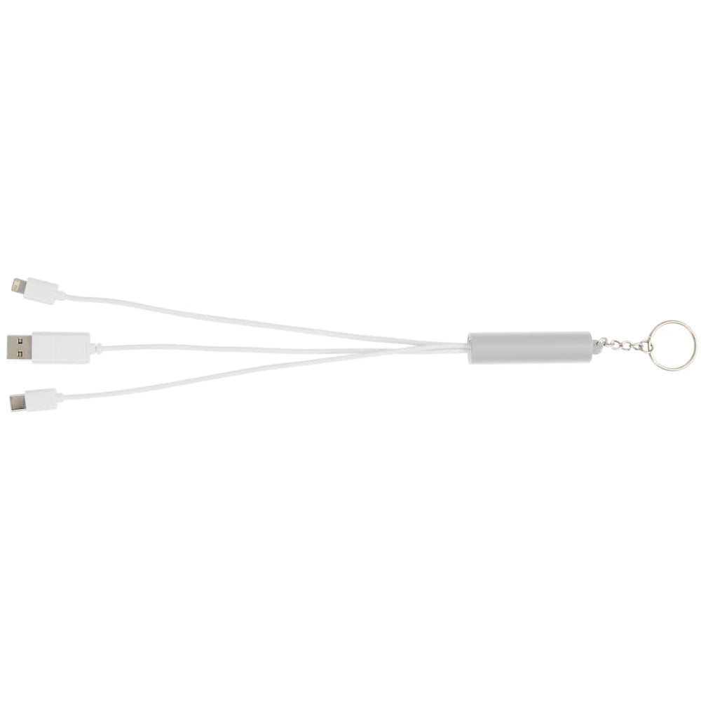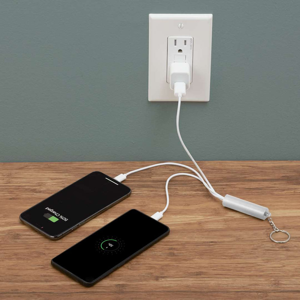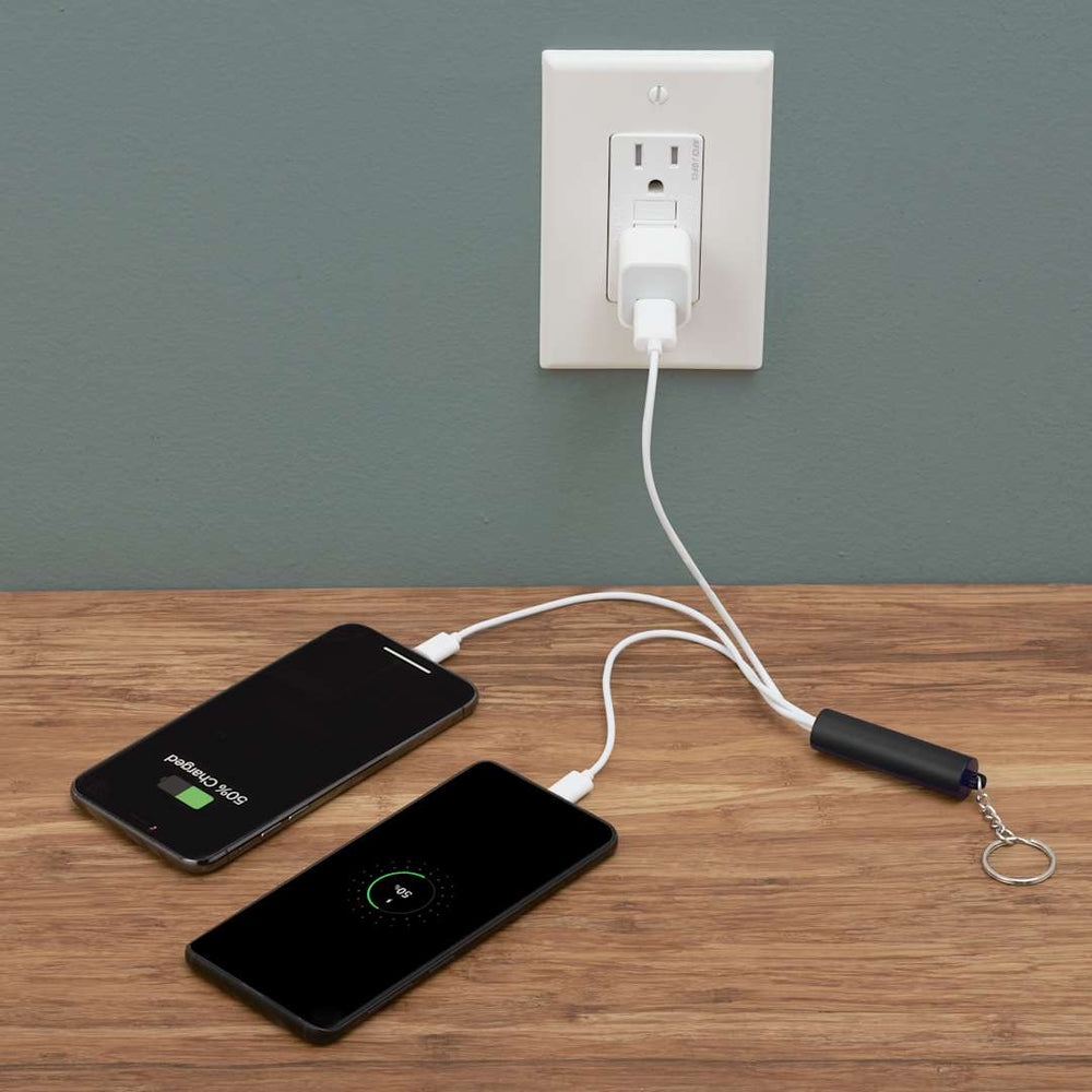 The Route Light Up 5-in-1 Charging Cable is a multi-use cable. It features a USB-A Input adapter with Type-C input tip, USB/Type C output tip, and a 2-in-1 dual compatible output tip for both iOS and Android devices with 2A current. Cable length (not including the head): 8.5 inch. This 5-in-1 cable also comes with a key chain for convenient carrying. This item must be lasered to reveal the light up function. Not compatible with iPad Pro. It is recommended to use an AC adapter, power bank or car charger to charge devices instead of using outputs from laptop or computer as power source.