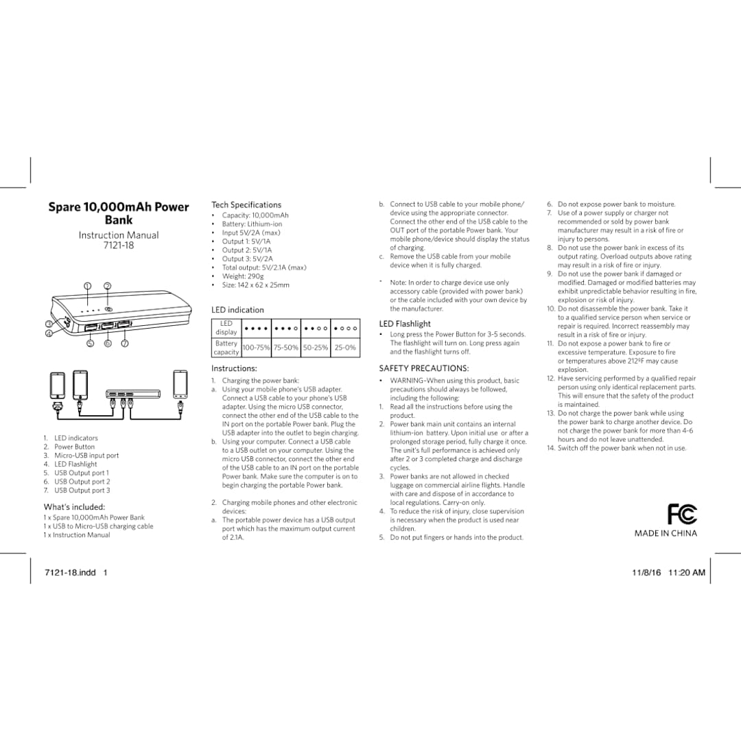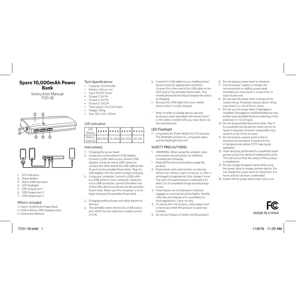 The Spare 10000 mAh Power Bank features a 10,000 mAh/37Wh Grade A Lithium Ion battery, LED indicator lights and a flashlight. Charge up to three devices at once with a max output of 5V/2.1A. Includes a USB-to-Micro-USB connecting cable which can recharge the battery backup or other devices with a Micro-USB input, like Android Smartphones from Samsung®, Motorola®, HTC®, Nokia®, and others. Power banks are permitted in carry-on luggage only, and at the discretion of TSA agents. Please charge the power bank before initial use.