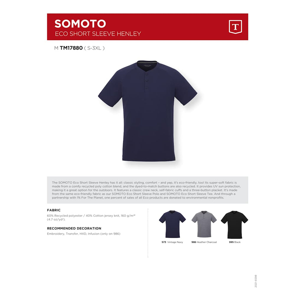 The men’s Somoto Eco Short Sleeve Henley has it all: classic styling, comfort – and yep, it’s eco-friendly, too! Its super-soft fabric is made from a comfy recycled poly cotton blend, and the dyed-to-match buttons are also recycled. It provides UV sun protection, making it a great option for the outdoors. It features a classic crew neck, self-fabric cuffs and a three-button placket. It’s made from the same eco-friendly fabric as our Somoto Eco Short Sleeve Polo and Somoto Eco Short Sleeve Tee. And through a partnership with 1% For The Planet, one percent of sales of all Eco products are donated to environmental nonprofits.