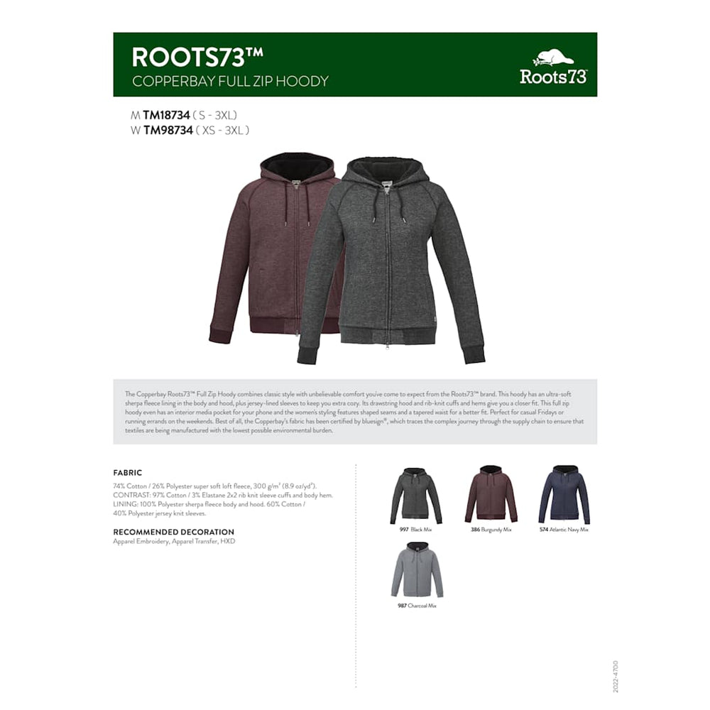 The women’s Copperbay Roots73 Full Zip Hoody combines classic style with unbelievable comfort you've come to expect from the Roots73 brand. This hoody has an ultra-soft sherpa fleece lining in the body and hood, plus jersey-lined sleeves to keep you extra cozy. Its drawstring hood and rib-knit cuffs and hems give you a closer fit. This full zip women's hoody even has an interior media pocket for your phone, plus shaped seams and a tapered waist for a better fit. Perfect for casual Fridays or running errands on the weekends. Best of all, the Copperbay’s fabric has been certified by bluesign®, which traces the complex journey through the supply chain to ensure that textiles are being manufactured with the lowest possible environmental burden.