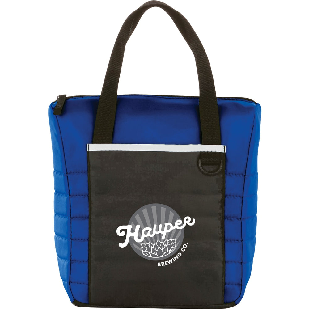 The Quilted 12-Can Lunch Cooler features a quilted design with a large front pocket for decorating, as well as an insulated PEVA lining and top grab handles.