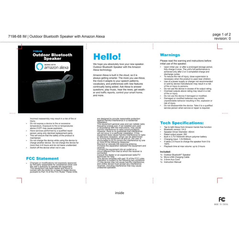 Take Alexa with you into the great outdoors! Instead of connecting to Alexa with Wifi, Alexa can now operate from your Bluetooth. Simply push the microphone button and Alexa is activated. With a 5 Watt output the speaker will fill any room or campsite. The speaker is sealed tight with a waterproof rating of IPX6, you don't have to worry about your speaker getting wet. With over 6hrs of playback time at max volume you don't need to worry about charging the speaker every couple of hours. Charging time: 2.5hrs. Includes micro usb charging cable and 3.5mm Aux Cable. Hands free music controls and a built in microphone. Bluetooth working range is 10meters(33ft)