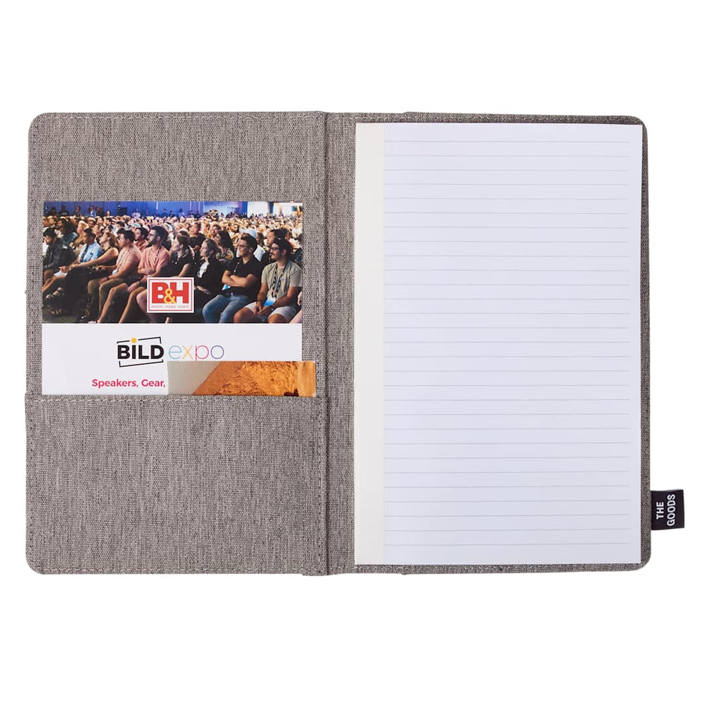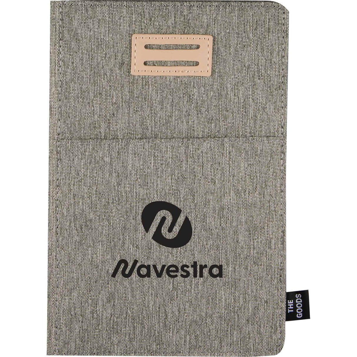 THE GOODS™ 5.5" x 8.5" Recycled Refillable Journal is a versatile choice for staying organized. Featuring a 100% recycled polyester cover, this journal includes practical pockets on the front and inside cover, perfect for storing business cards, your smartphone, pens, and more. With 50 sheets of recycled lined paper, it’s designed for eco-conscious users who value functionality. By choosing this journal, you’re making a positive impact on the environment through a partnership with 1% For The Planet, as a portion of each sale supports environmental nonprofits.