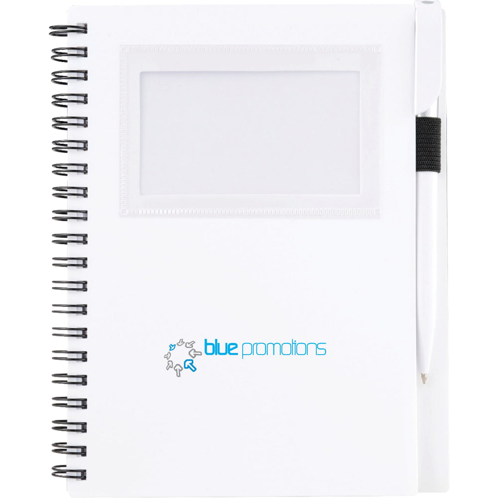 The Bullet 5.5" x 7" FSC Star Spiral Notebook with Pen has a clear window on its sturdy polypropylene front cover to display your photo ID or store business cards. It comes with a matching twist-action ballpoint pen, which stores neatly inside the notebook's built-in pen loop. The Star Spiral Notebook contains 70 ruled sheets of FSC Mix paper and will be packed separately from the included pen.