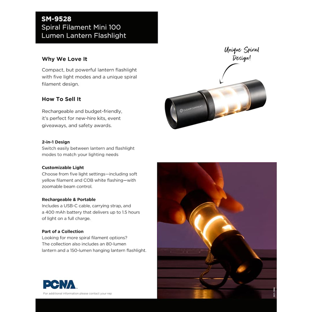 The Mini Spiral Filament 100 Lumens Lantern Flashlight is the ultimate multi-functional light for any adventure. Small yet powerful, this versatile light works as both a lantern and flashlight, with five light modes to match your needs: COB white, COB white flashing, and soft yellow filament in 50%, 70%, and 100% brightness. The zoomable function allows you to switch between a narrow and wide beam, giving you the perfect amount of light for any setting. Equipped with a 400 mAh rechargeable battery, this compact lantern provides up to 1.5 hours of light on a full charge, recharging in just 1.5 hours with the included USB-C cable. The lightweight design, carrying strap, and compact size make it easy to take anywhere, while its use of recycled materials offers an eco-friendly touch.