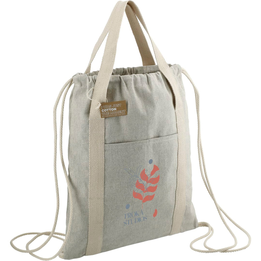 The Repose 5oz. Recycled Cotton Drawstring Bag is made from recycled pre-consumer cotton. It features a front slip pocket as well as an internal pocket for keeping your water bottle upright. Use the 5.5" drop handles or the shoulders straps for comfy carrying. Through a partnership with 1% For The Planet, one percent of sales of all EcoSmart products are donated to environmental nonprofits.