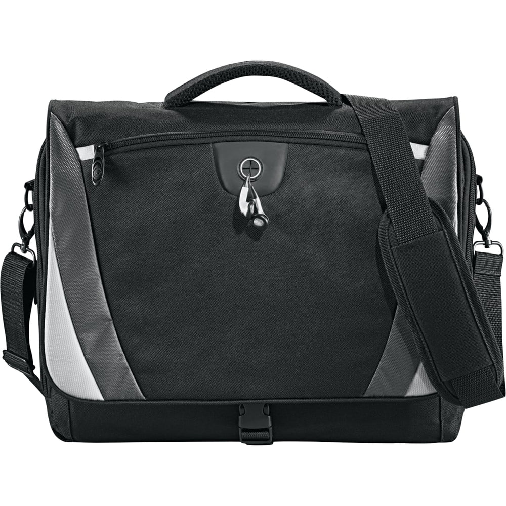 Large main zippered compartment with built-in laptop sleeve (holds 15" laptop), additional rear compartment behind laptop sleeve. Features zippered front pocket with earbud port, organization panel under front flap, rear pocket with hook and loop closure. Detachable, adjustable shoulder strap.