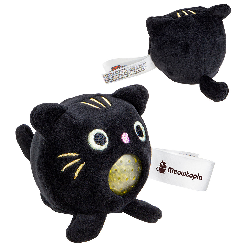 Clear thermal plastic rubber ball filled with colorful gel-filled beads, covered with a plush design in the shape of a black cat. Beads inside give a massaging feel when squeezed out of cover. Ball returns to original shape when released.