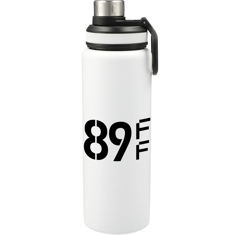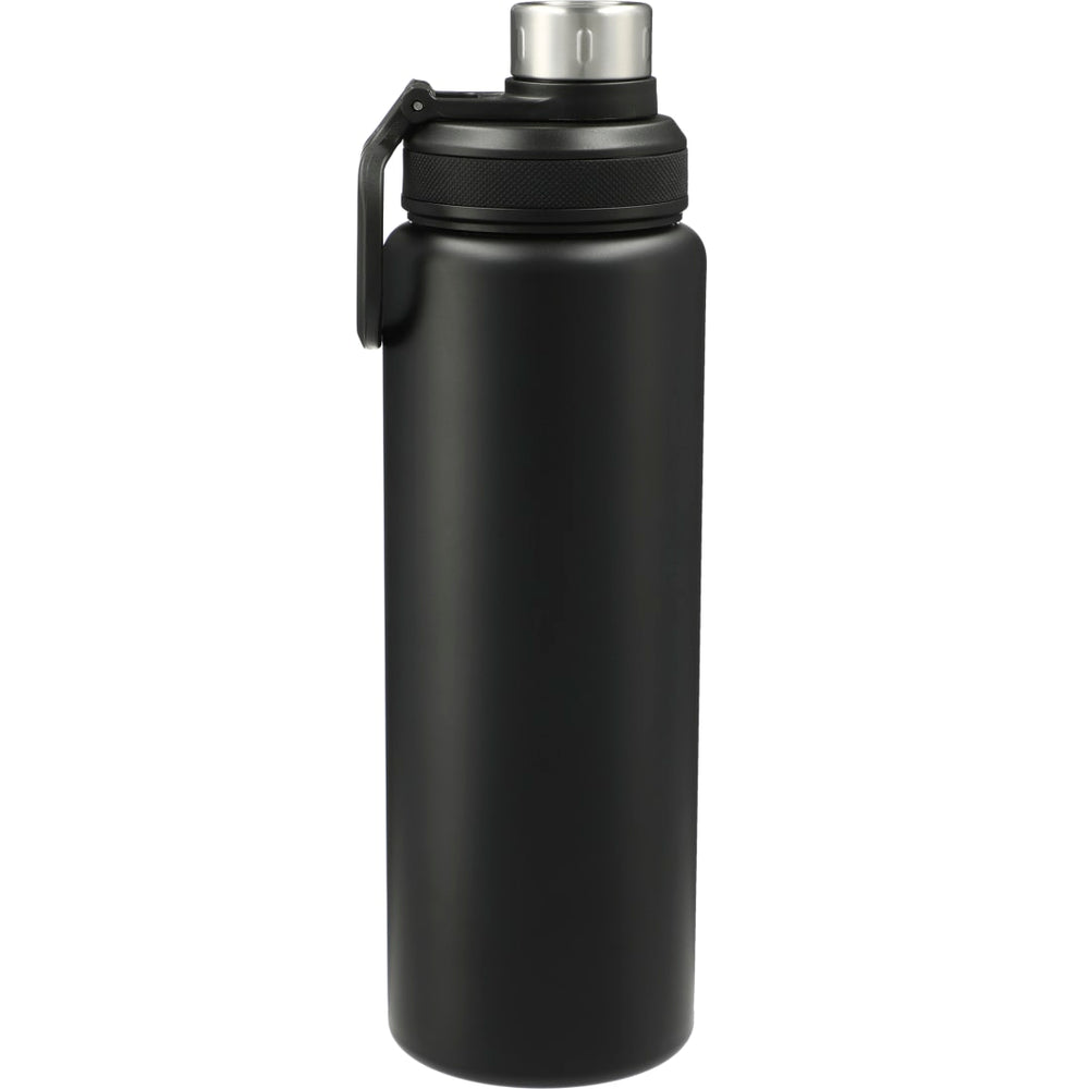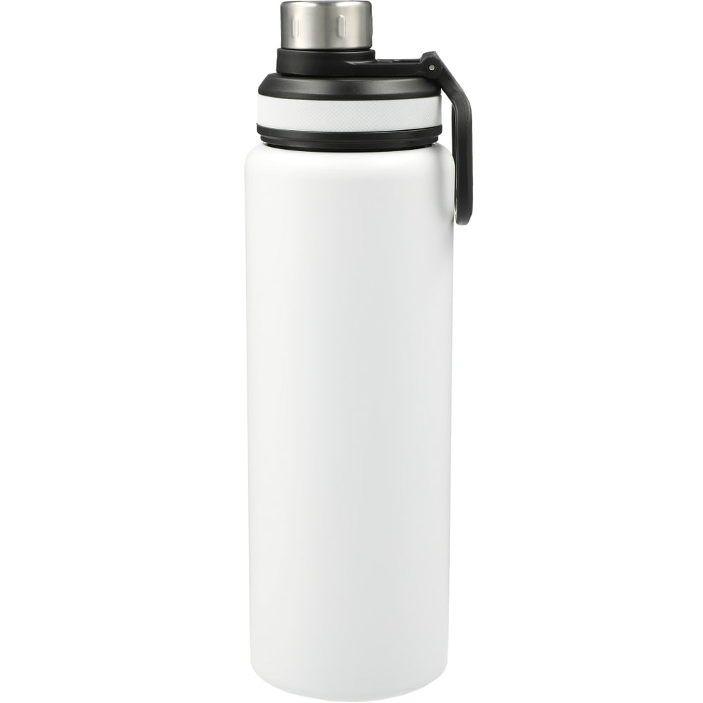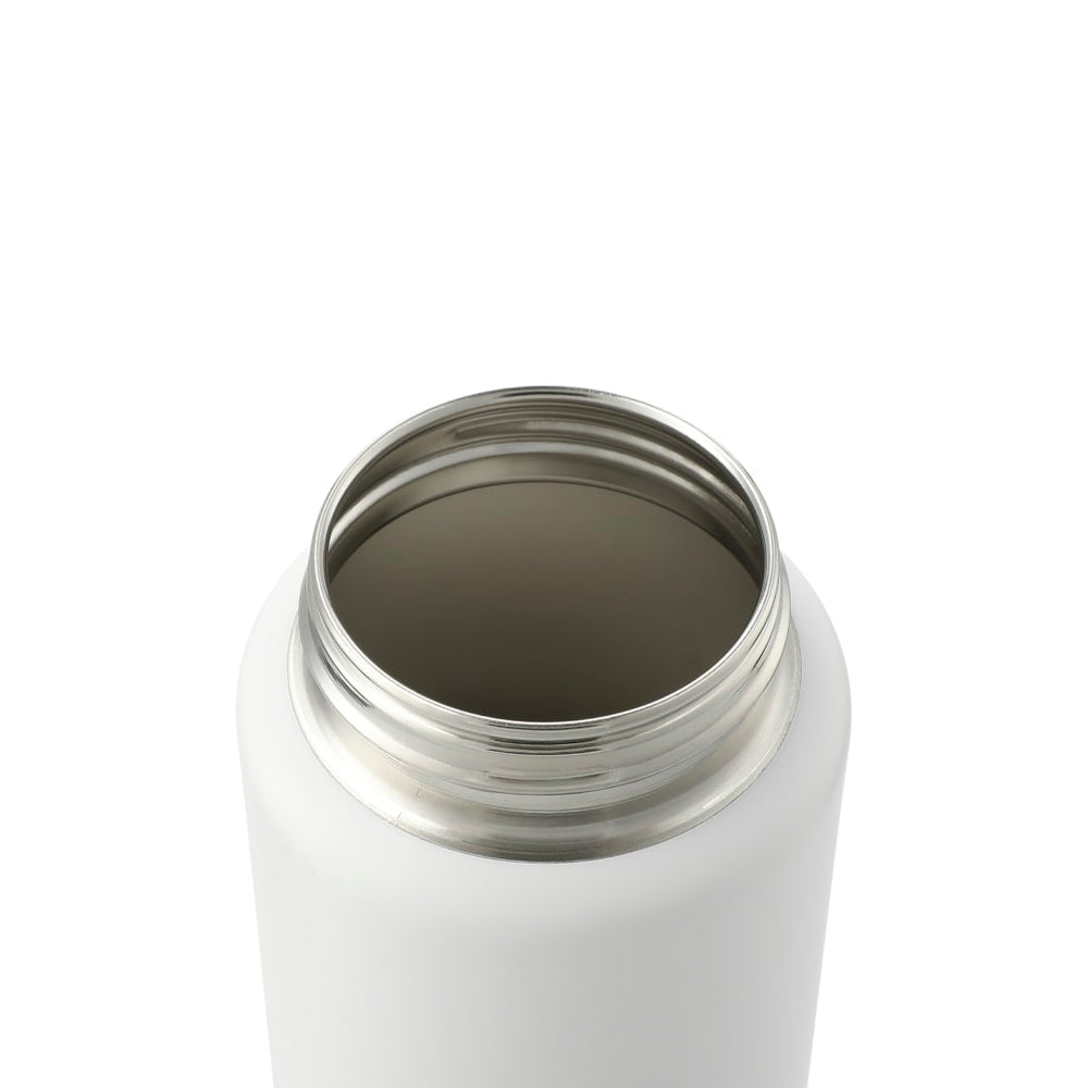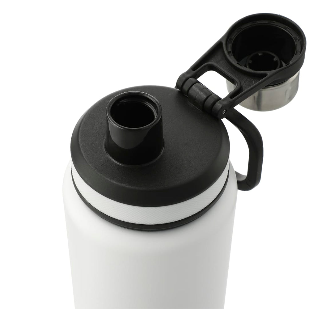 Durable, single-wall, stainless steel construction. On-trend matte coating. Dual opening, screw-on, stainless steel cap on the main lid with silicone band. Also features a built-in, durable, plastic handling loop. Wide opening for comfortable filling and pouring. Perfect for ice cubes. Fits most standard car cup holders. 32oz.